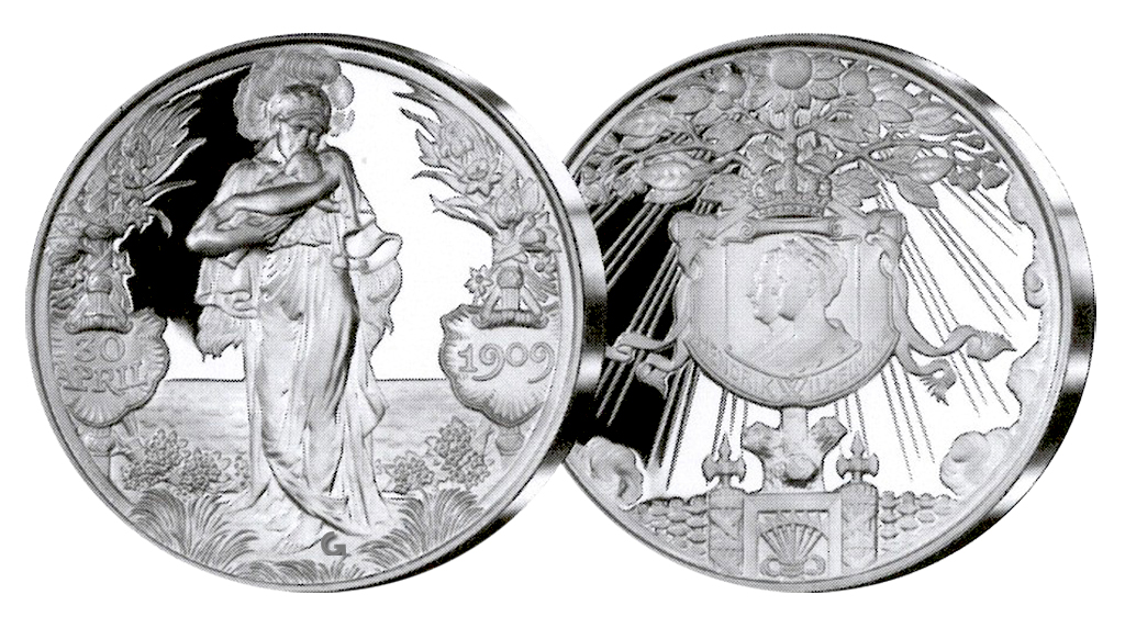 Op 30 april 1909 ging er een zucht van verlichting door het land. ‘s Morgens om tien vóór zeven werd in Den Haag Juliana Louise Emma Marie Wilhelmina, prinses der Nederlanden, prinses van Oranje-Nassau, hertogin van Mecklenburg geboren. Heel Nederland vierde uitbundig feest want hoewel Koningin Wilhelmina en prins Hendrik al sinds 7 februari 1901 waren gehuwd, was het paar nog steeds kinderloos en na een tragische miskraam werd algemeen gevreesd dat het wel eens zo zou kunnen blijven. Het gevaar was groot dat er dan een vreemde (Duitse) vorst de Nederlandse kroon zou gaan dragen! Zover is het echter niet gekomen. Op de penning die ter gelegenheid van deze heugelijke geboorte is ontworpen, koestert de Nederlandse Maagd het pasgeboren kind. Op de keerzijde onder een oranjeboom het gekroonde portret van koningin Wilhelmina en prins Hendrik. Op de onderzijde van de penning is een deel van een ‘Hollandse Tuin’ afgebeeld. Dit eeuwenoude symbool van de Nederlandse vrijheid bestaat uit een omheining met een gesloten poort waarin de Nederlandse normen en waarden een veilige plaats hebben gevonden.