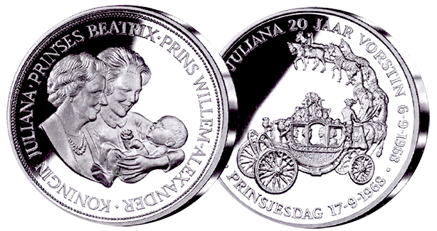 Een penning vol symboliek markeert het 20-jarig regeringsjubileum van koningin